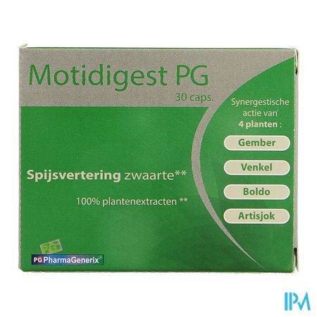 Motidigest Pg Pharmagenerix Caps 30 is een voedingssupplement, verkrijgbaar in uw buurtapotheek of online apotheek. Neem niet meer dan de aanbevolen dagelijkse dosis vermeld op de verpakking. Het vervangt geen gezonde levensstijl en gevarieerde en evenwichtige voeding. Vraag raad aan uw apotheker. Het product altijd buiten het bereik van kinderen houden.